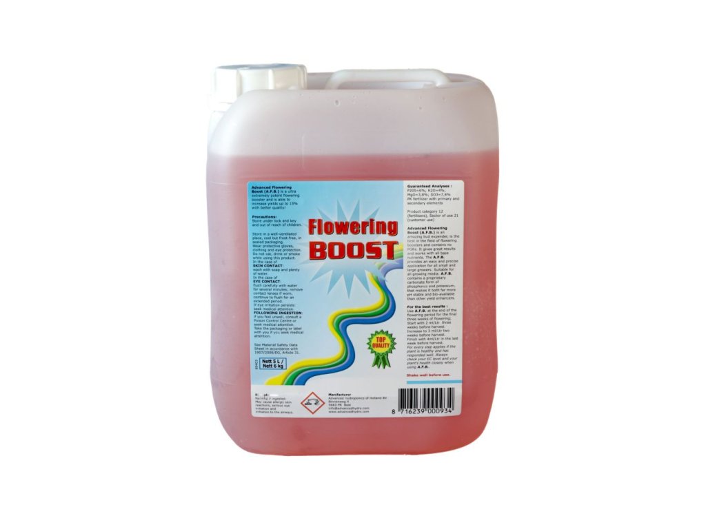 Advanced Hydroponics Flowering Boost (A.F.B.) je úžasný expender poupat, je nejlepší v oblasti boosterů kvetení a neobsahuje žádné PGR. Poskytuje skvělé výsledky a funguje se všemi základními živinami. A.F.B. poskytuje snadnou a přesnou aplikaci pro všechny malé i velké pěstitele. Vhodný pro všechny pěstební substráty. A.F.B. obsahuje patentovanou uhličitanovou formu fosforu a draslíku, díky které je mnohem stabilnější v pH i biologicky dostupnější než jiné látky zvyšující výnos. Pro dosažení nejlepších výsledků : A.F.B. používejte na konci období kvetení po dobu posledních tří týdnů kvetení. Začněte s dávkou 2 ml/l tři týdny před sklizní. Dva týdny před sklizní zvyšte dávku na 3 ml/ltr. Poslední týden před sklizní dokončete dávkou 4 ml/ltr. Pro každý krok platí, že pokud je rostlina zdravá a dobře reaguje. Při používání přípravku A.F.B vždy pečlivě kontrolujte hladinu EC a zdravotní stav rostliny.