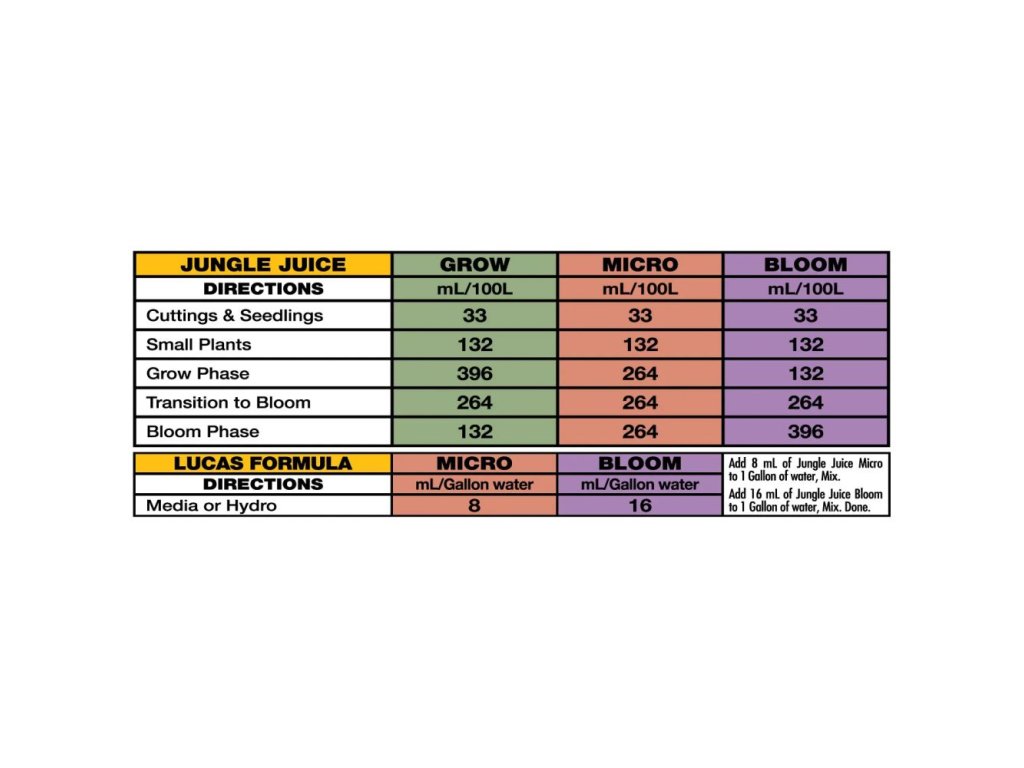 Všechny složky se používají po celý pěstební cyklus společně. Nejdříve do vody přidáváme složku Micro a důkladně rozmícháme. Pak se postupně přidá složka Grow a nakonec složka Bloom. Dávkování všech tří složek Jungle Juice může být stejné, ale podle kalkulátoru výrobce si můžete zvolit i jinou kombinaci s ohledem na druh plodiny.