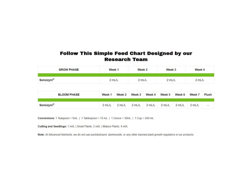 Koncentrované tekuté enzymy se míchají v poměru 2 ml na 1 litr vody. Aplikuje se během prvních šesti týdnů období květu. Sensizym od Advanced Nutrients se používá také na revitalizaci rockwoolu.