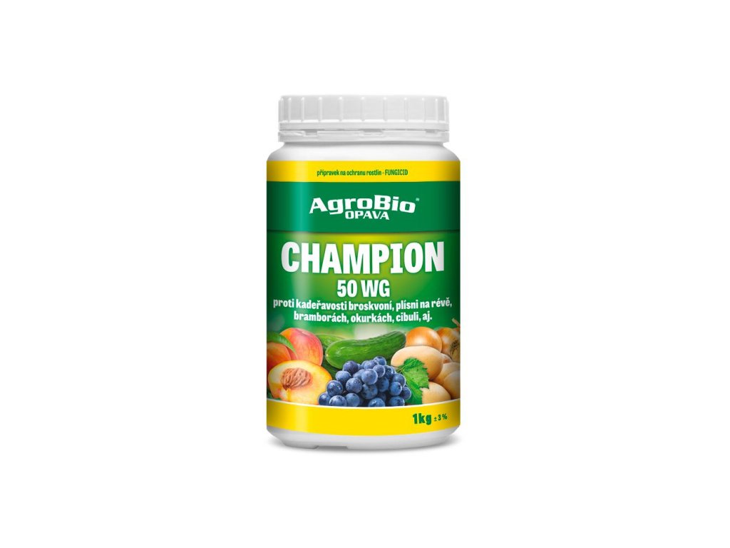 AgroBio Champion 50 WG 1x1 kg je kontaktní fungicidní a baktericidní přípravek na ochranu rostlin před houbovými a bakteriálními chorobami. Používá se také k ochraně květů meruněk proti mrazu. Účinná látka: hydroxid měďnatý 768 g/kg. Používá se na tyto plodiny: brambor (plíseň bramboová), okurka (plíseň okurková), cibule, česnek (plíseň cibulová), broskvoň (kadeřavost listů), jádroviny (korové nekrózy), hrušeň, jabloň (bakteriální spála), slivoň (puchrovitost), meruňka (korové nekrózy, ochrana květů proti mrazu), réva vinná (plíseň révová, červená spála), fazol na lusky (antraknóza fazolu).