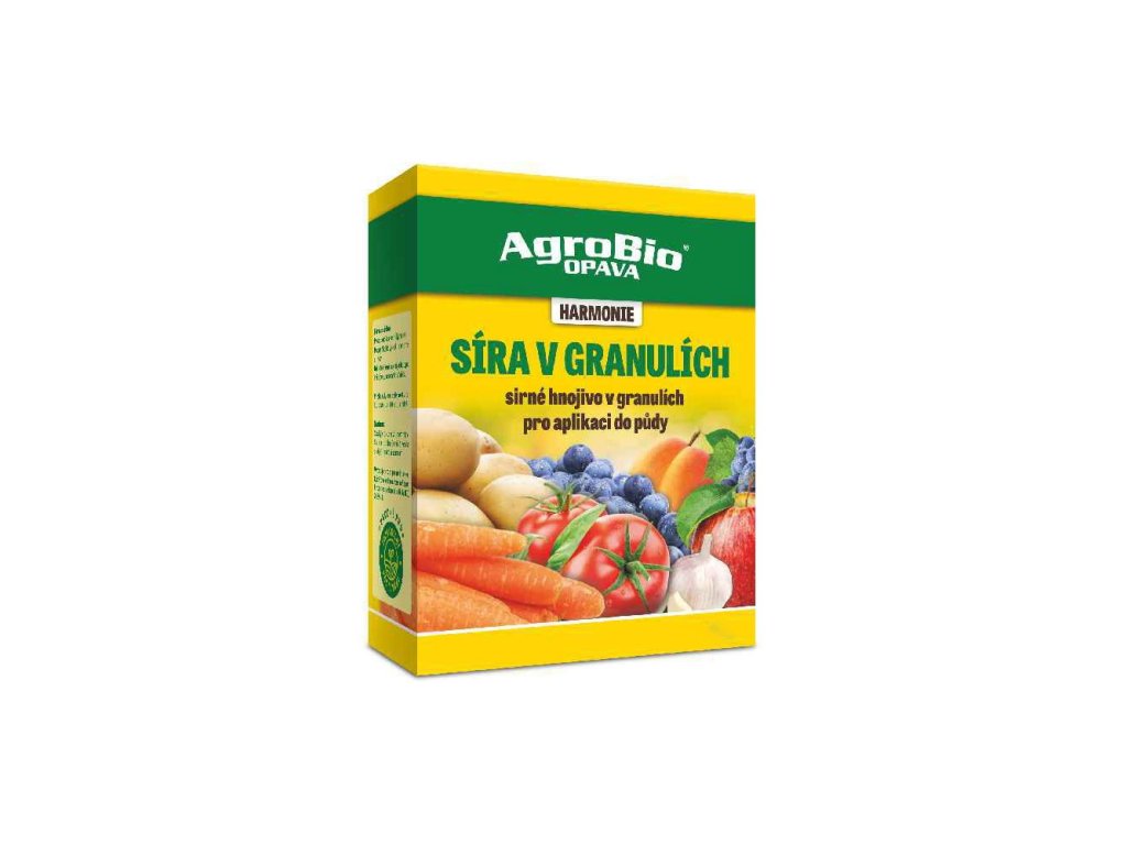 Minerální granulované sirné hnojivo založené na elementární síře. Aplikuje se posypem do zeminy. Hnojivo AgroBio HARMONIE Síra v granulích je vhodné pro zeleninu, ovocné stromy, révu vinnou.