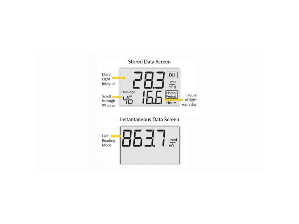 - Kapacita záznamu dat 99 dní (DLI a fotoperioda), 10 dní (30minutové průměry PPFD/ePPFD)