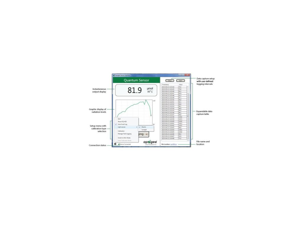 Sonda SQ-520 může být připojena přímo k počítači USB kabelem k bodovému nebo grafovému a protokolovému měření PPFD (fotosyntetická hustota fotonového toku = množství PAR, které příjme rostlina z osvětlení) v reálném čase pomocí přiloženého softwaru. Zároveň může sloužit i jako samostatná protokolová jednotka jednoduchým připojením k běžnému 5 V DC USB adaptéru. Vnitřní paměť uvnitř sondy disponuje kapacitou 10 000 uživatelsky specifikovaných periodických měření s možností uložení do formátu CSV.
