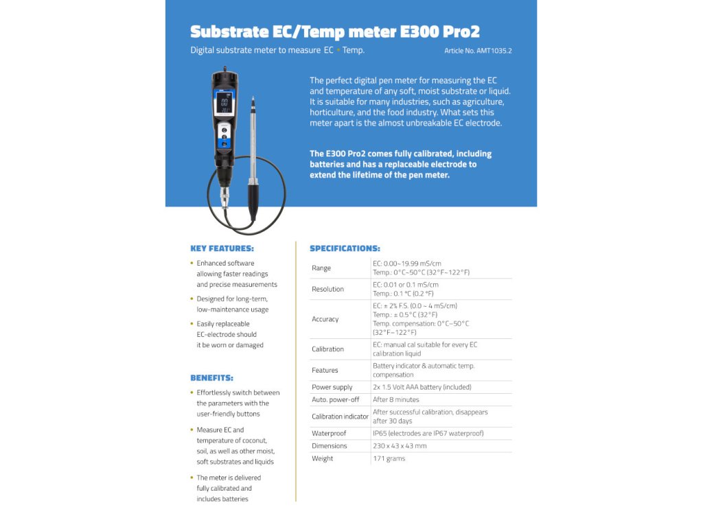 Přístroj E300 Pro je ideální pro měření EC a teploty kokosové půdy a jiných vlhkých, měkkých substrátů a kapalin. Měřič má moderní a robustní kryt se snadno ovladatelnými tlačítky. Součástí přístroje E300 Pro je elektroda EC nebývalé kvality. Měřič je dodáván plně kalibrovaný a obsahuje baterie.