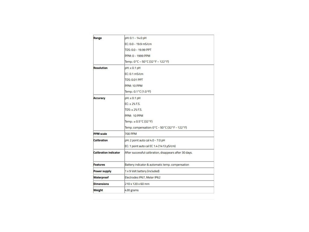 - TDS: 0.01 PPT / PPM: 10 PPM