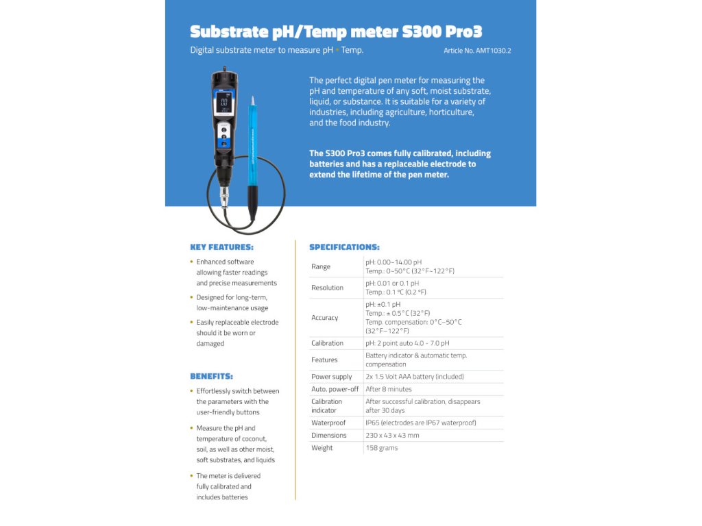 Digitální měřič pH/teploty půdy AMT S300 PRO 3.0 lze použít k měření pH a teploty zeminy a kokosových substrátů nebo kapalin.