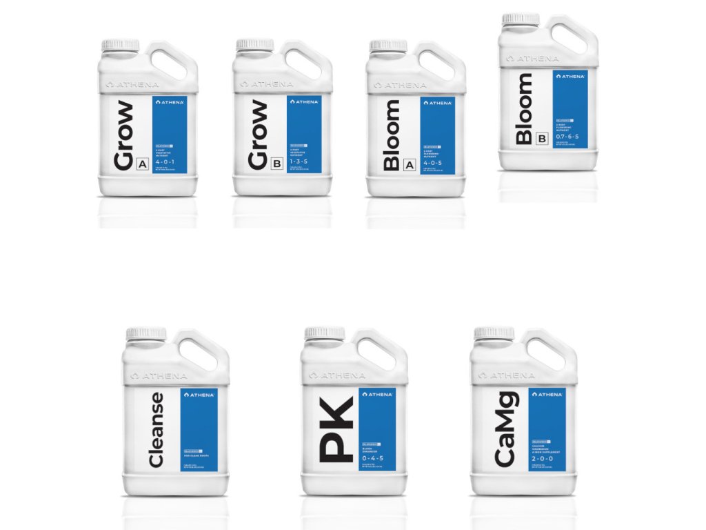 Athena Liquid Blended Line Medium, sada tekutých hnojiv obsahuje Athena Liquid Grow A+B 3.78 l na růst, Athena Liquid Bloom A+B 3.78 l na květ, Athena Liquid Cleanse 3.78 l, Athena Liquid CaMg 3.78 l, Athena Liquid PK 3.78 l a odměrný džbánek.