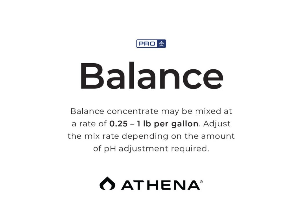 Athena Pro Balance umožňuje pěstiteli přizpůsobit sílu úpravy pH jeho jedinečné situaci. Koncentrát Pro Balance lze míchat v dávce 0,25-1 lb na galon (cca 0.1 až 0.5 kg na 3.8 litru vody). Míru míchání a dávkování upravte v závislosti na množství požadované úpravy pH.
