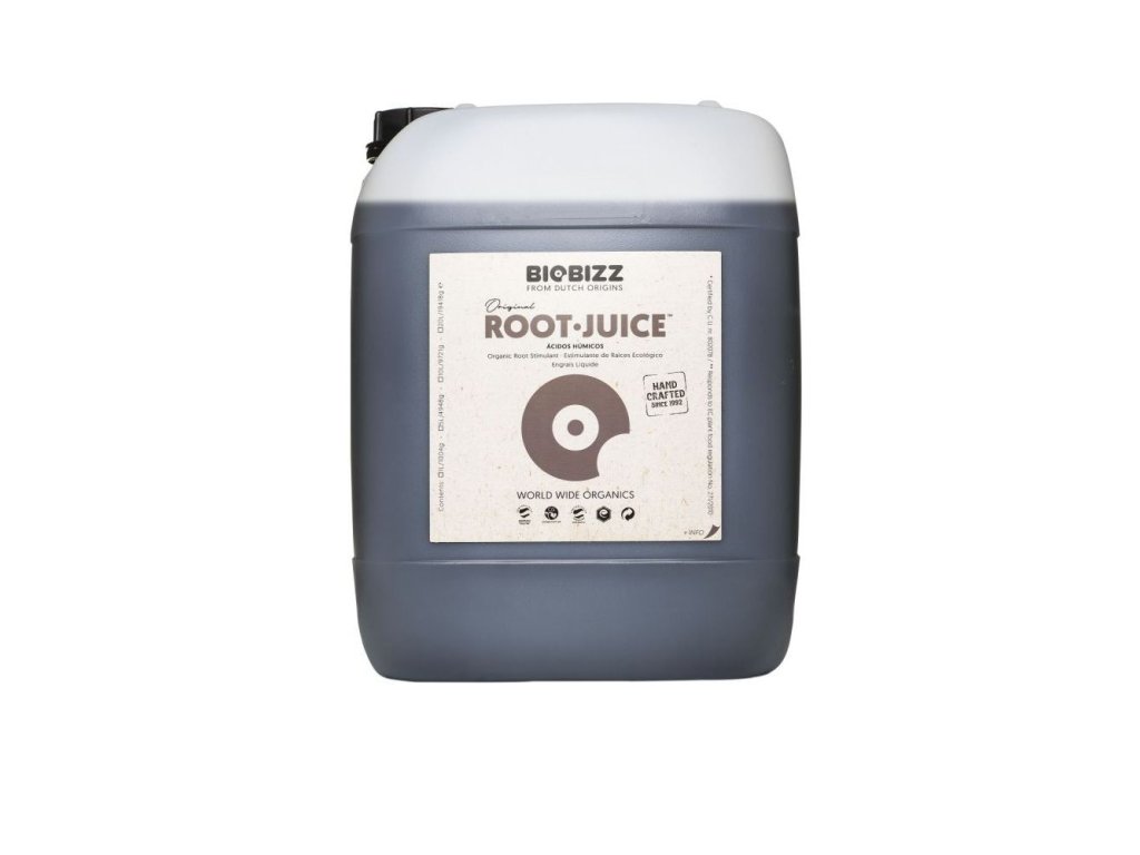 Bio kořenový stimulátor BioBizz Root Juice 10 l obsahuje kromě extraktu z mořských řas také vysoce kvalitní huminové a fulvové kyseliny. Speciální receptura podporuje intenzivní kořenový rozvoj a stimuluje mikroživot v blízkosti kořenového systému. BioBizz Root Juice také povzbuzuje příjem živin, posiluje zdraví a celkovou odolnost rostlin.