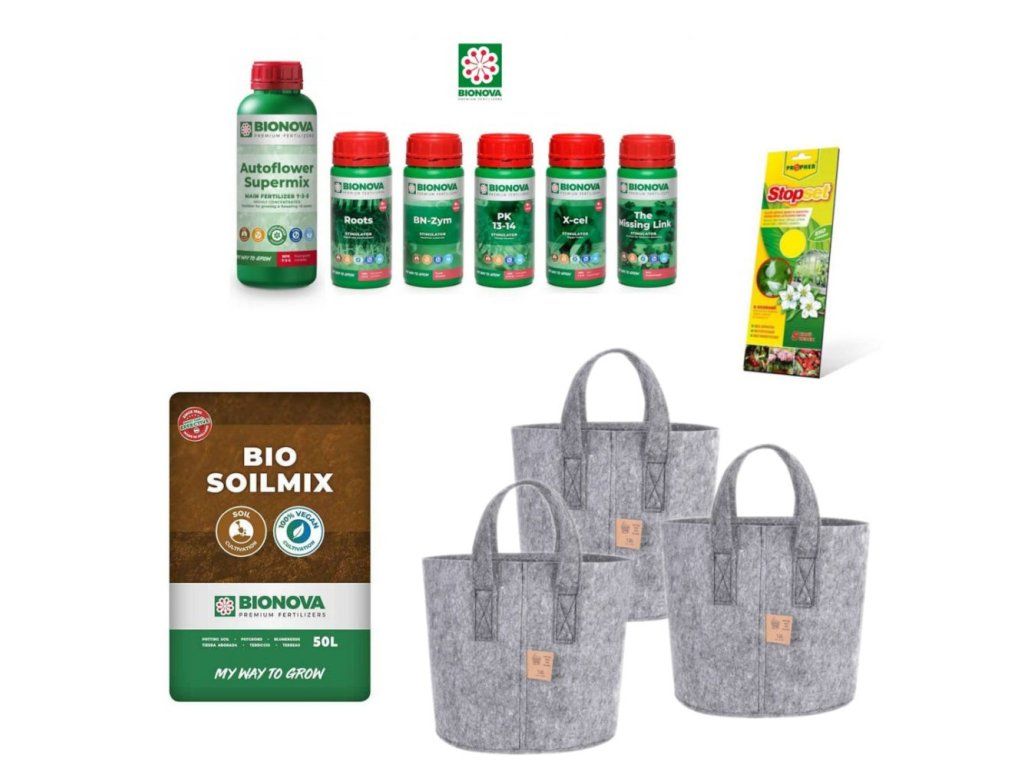 Ideální sestava pro ty, kdo chtějí pěstovat 3 rostliny venku v autoflower stylu. Tento set obsahuje prémiový substrát plný mikroorganismů, prodyšné textilní květináče, ucelenou řadu hnojiv Bionova, lepové desky a odměrku.