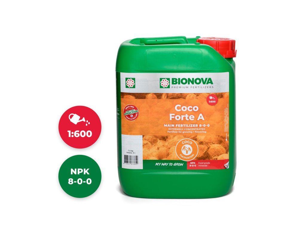 Základní hnojivo pro celý pěstební cyklus BioNova Coco Forte A+B obsahuje všechny důležité živiny ve správném poměru. Je vhodné pro všechny typy kokosových substrátů včetně dehydratovaných desek a briket.