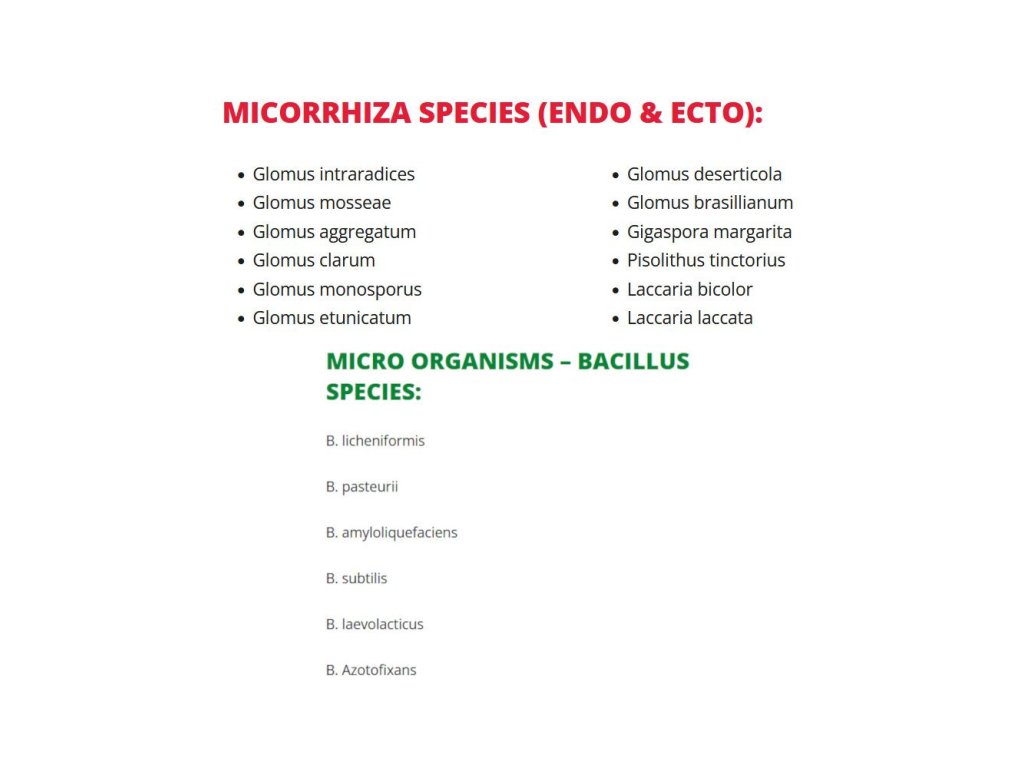 Směs hnojiv NPK a mikroorganismů 6-5-7. 6 % celkového dusíku (N), z toho: 2 % amonný dusík (N), 4 % dusičný dusík (N), 5 % oxid fosforečný (P2O5), 7 % oxid draselný (K2O), 3 % oxid siřičitý (SO3). Složení: Obsahuje mikroorganismy, mykorhizu (viz úplný seznam níže), bacily, bentonit, mořské řasy, vápno, vinnou révu, kakosty, enzymy, aminokyseliny, vitamíny C - B1 - E, humáty, přírodní chelátované stopové prvky, jílové minerály, kompost a Ascophillum Nodosum (řasy).