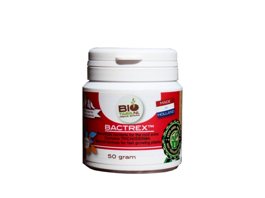 Bactrex od Biotabs tvoří organická směs huminové kyseliny, trichodermy a osmi druhů prospěšných bakterií. Půdní bakterie získávají energii z mrtvých kořenových buněk nebo zbytkových organických materiálů. Kořenové Rhizobakterie zvyšují rozpustnost fosforu, draslíku nebo vápníku. Při masivním rozvoji kořenového systému se skvěle doplňují s mykorhiza (Mycorrhizae) houbami.