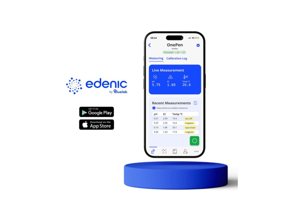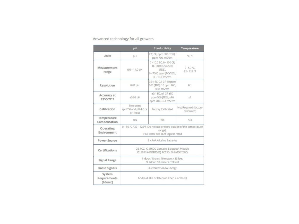 Kvalitní měřící přístroj 3v1 měří současně pH, vodivost (EC/PPM) i teplotu a napomáhá tak s příjmem živin. Připojte se k aplikaci Edenic přes Bluetooth pro sdílení, aktualizace a komplexní správu dat v reálném čase.