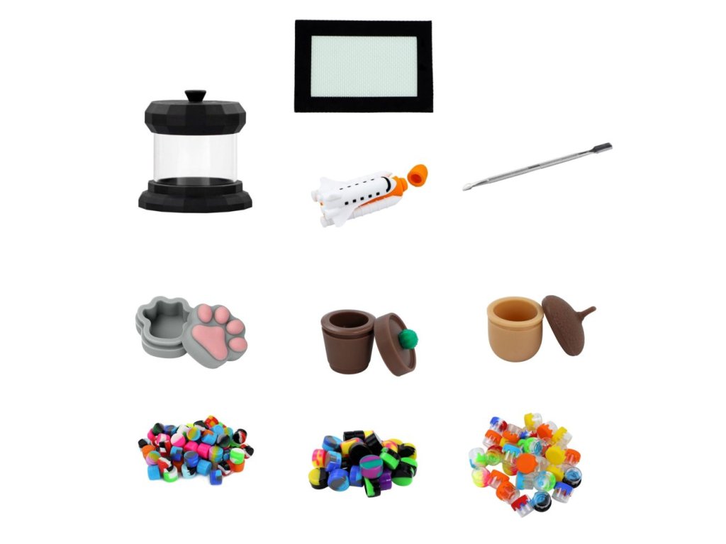 Bongthai Dab Set zahrnuje 6x silikonové pouzdro s různými designy, 1x silikonovou podložku, 1x dabovací nástroj, 1x nádobku, 1x rosin collector s titanovou špičkou.