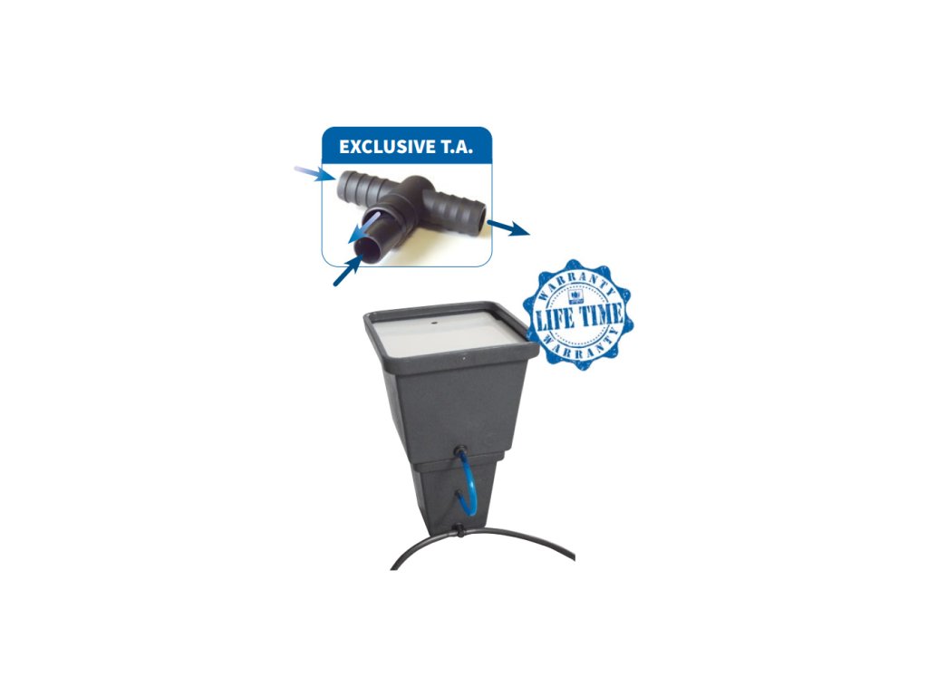 Controller ACS. Tato nádržka zajišťuje cirkulaci živného roztoku mezi květináči a umožňuje stabilizovat stejnou měrou úrovně pH a EC. Je to centrální nádržka, která umožňuje spolu propojit více hydroponických systémů a tak zajistit zalévání i v době dovolené.