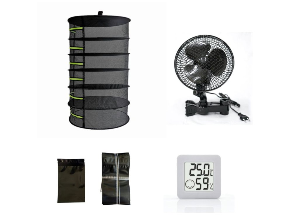 Sada na sušení bylinek Dry Set Urban 60 zahrnuje sušicí síť, oscilační ventilátor, balení neprůhledných Zip sáčků a jednoduchý kombinovaný teploměr a vlhkoměr.