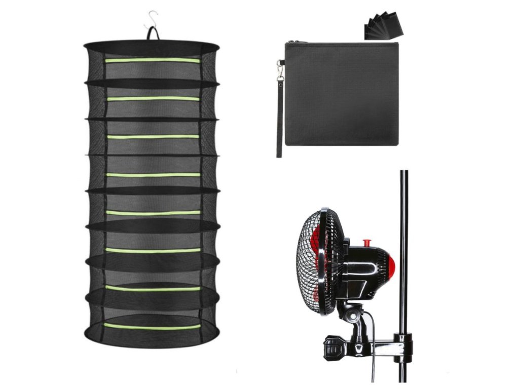 Jednoduchá sušicí sestava Dry Set Urban zahrnuje síť na sušení bylinek a hub, oscilační větráček, zip sáčky a měřič teploty a vlhkosti.