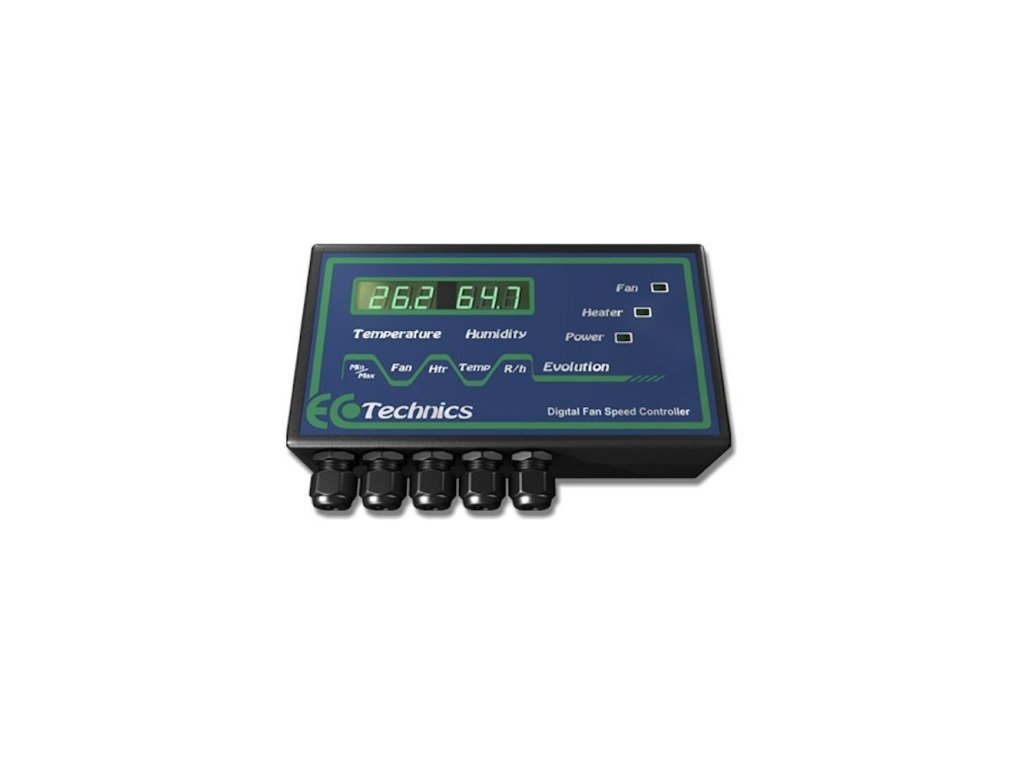 Fan controller umožňuje dokonalé řízení klimatu pomocí teplotního a vlhkostního senzoru na 5 metrovém kabelu. Digitální regulátor otáček EcoTechnics Evolution Fan Speed Controller je určen pro regulaci výkonu odtahového i přítahového ventilátoru (2x 6A) a vytápění s maximálním příkonem 3 kW.