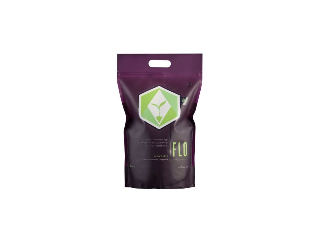 FLO je kompletní produkt na pěstování v zemině nebo kokosovém substrátu. Zajišťuje základní hnojení makro- a mikroživinami, přírodními stimulátory kořenů, růstu a květů, enzymy, křemičitany, aminokyselinami, enzymy, CalMag a živými mikroorganismy. Žádné další produkty nejsou potřeba.