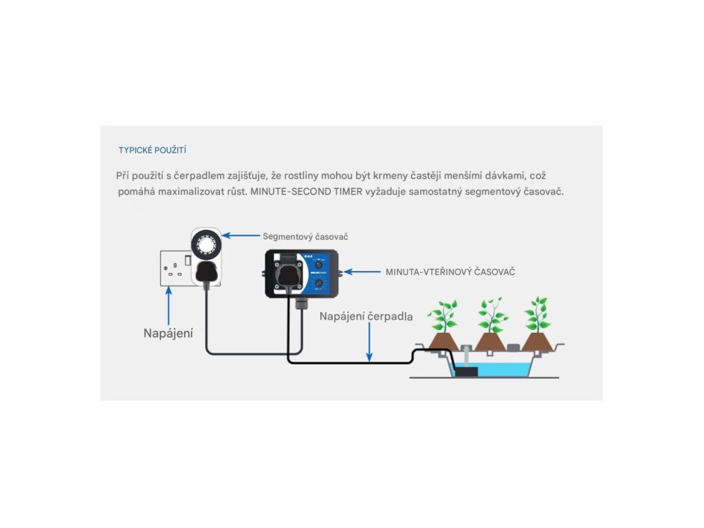 Časovač GAS Minute-Second Timer poskytuje další úroveň kontroly, která umožňuje menší a častější zalévání a dávkování živin. Vhodný pro pěstování. Určen pro čerpadla o celkovém příkonu max. 500 W.