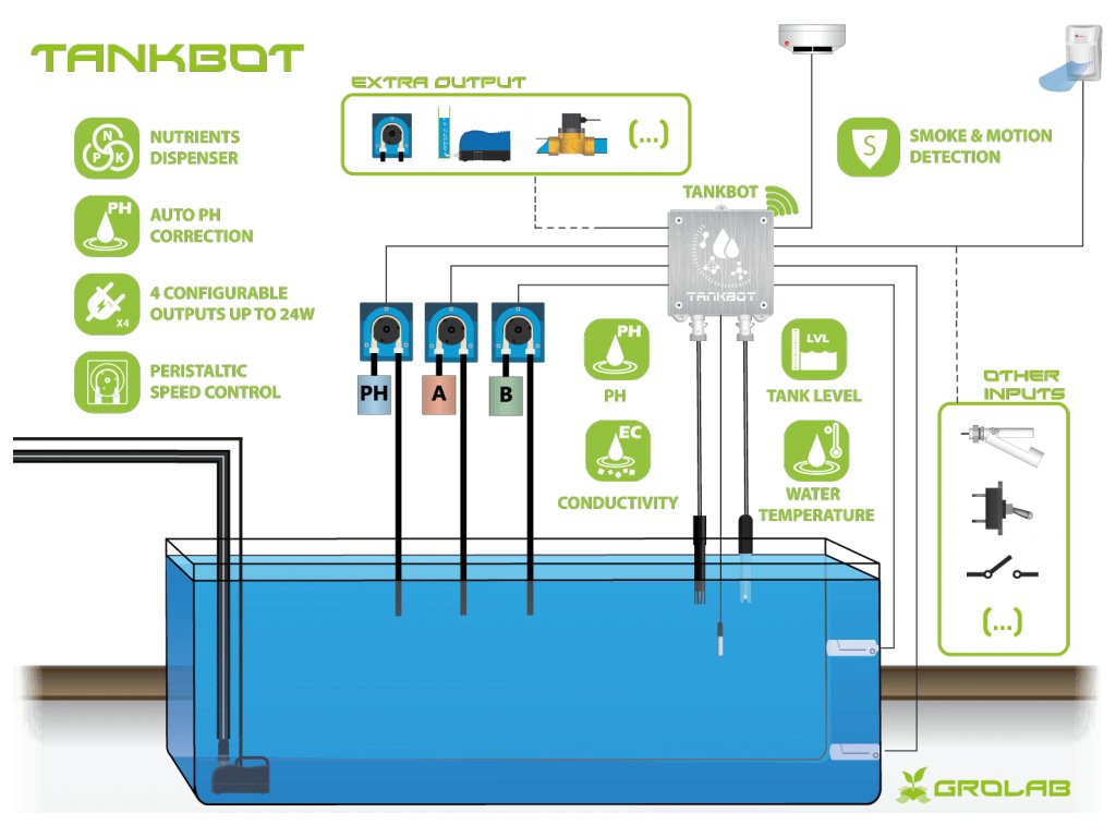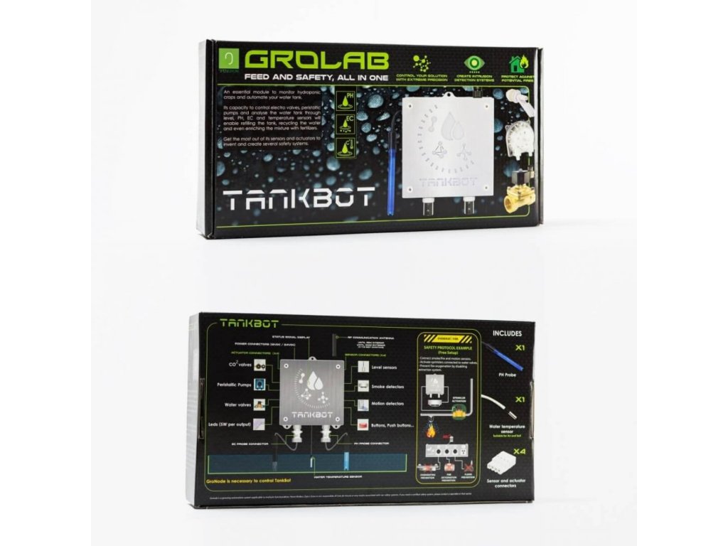 Ovládací jednotka TankBot je nejvšestrannějším a nejpřesnějším modulem z řady GroLab. Zařízení disponuje čtyřmi regulovatelnými 12V konektory pro řízení vodních, vzduchových nebo peristaltických čerpadel a solenoidových ventilů.