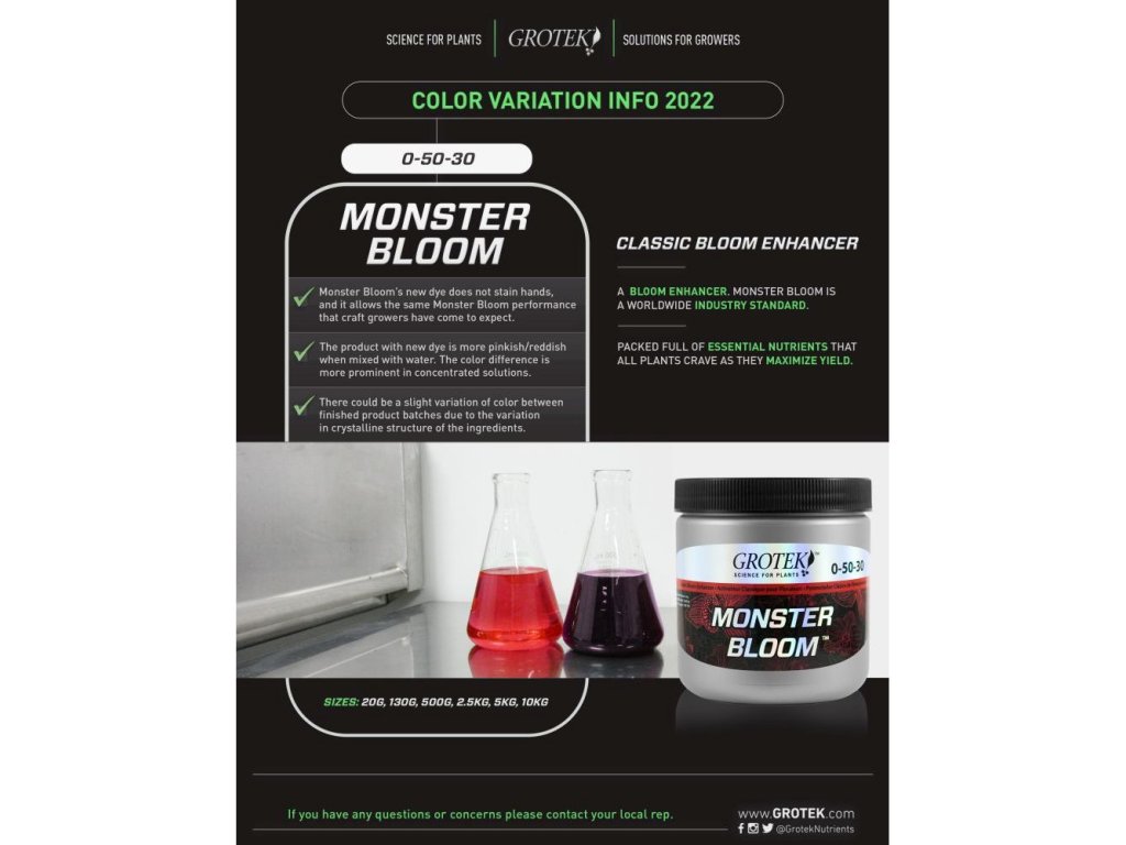 Skvěle rozpustný prášek Grotek Monster Bloom obsahuje také hořčík, který stimuluje metabolismus, a síru. Ta formuje důležité enzymy a pomáhá s tvorbou proteinů a některých vitamínů. Má pozitivní účinek na esenciální oleje a vůni bylinky.