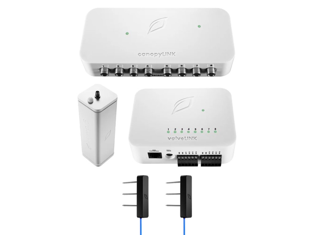 Zavlažovací sada LINKS je dokonalou sadou, která vám pomůže nastartovat automatizaci pěstování. Tento komplexní balíček obsahuje valveLINK, canopyLINK, Climalink a Terralink - a poskytuje vám tak možnost sledovat klima a substrát vaší pěstírny a zároveň bezproblémově ovládat zavlažování.