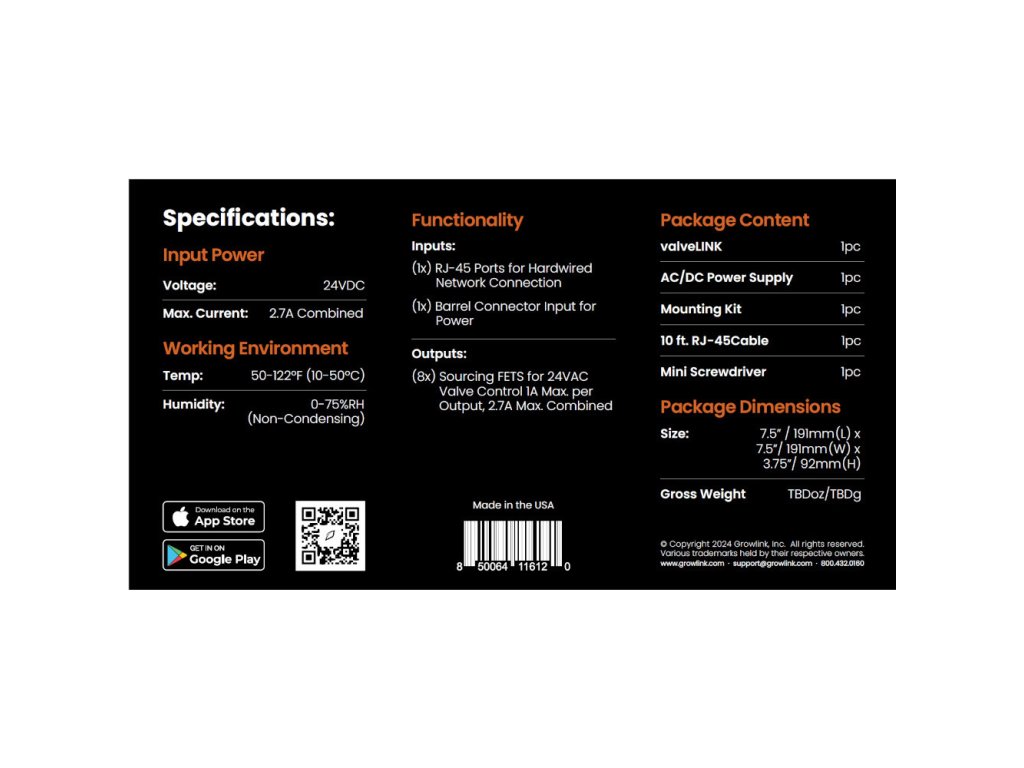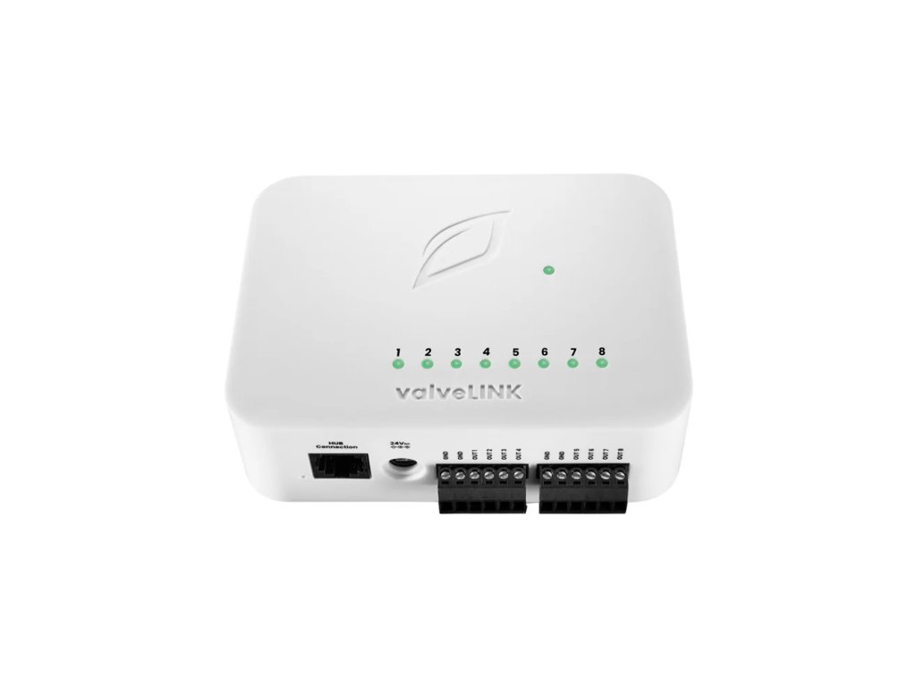 8kanálový ovladač valveLINK poskytuje přesné řízení zavlažování a je navržen tak, aby bez problémů spolupracoval se systémem Copilot společnosti Growlink pro automatické řízení zalévání a živení plodin. Díky osmi nezávislým kanálům pomáhá pěstitelům optimalizovat růst rostlin, zlepšit konzistenci výnosů a zefektivnit řízení zavlažování.