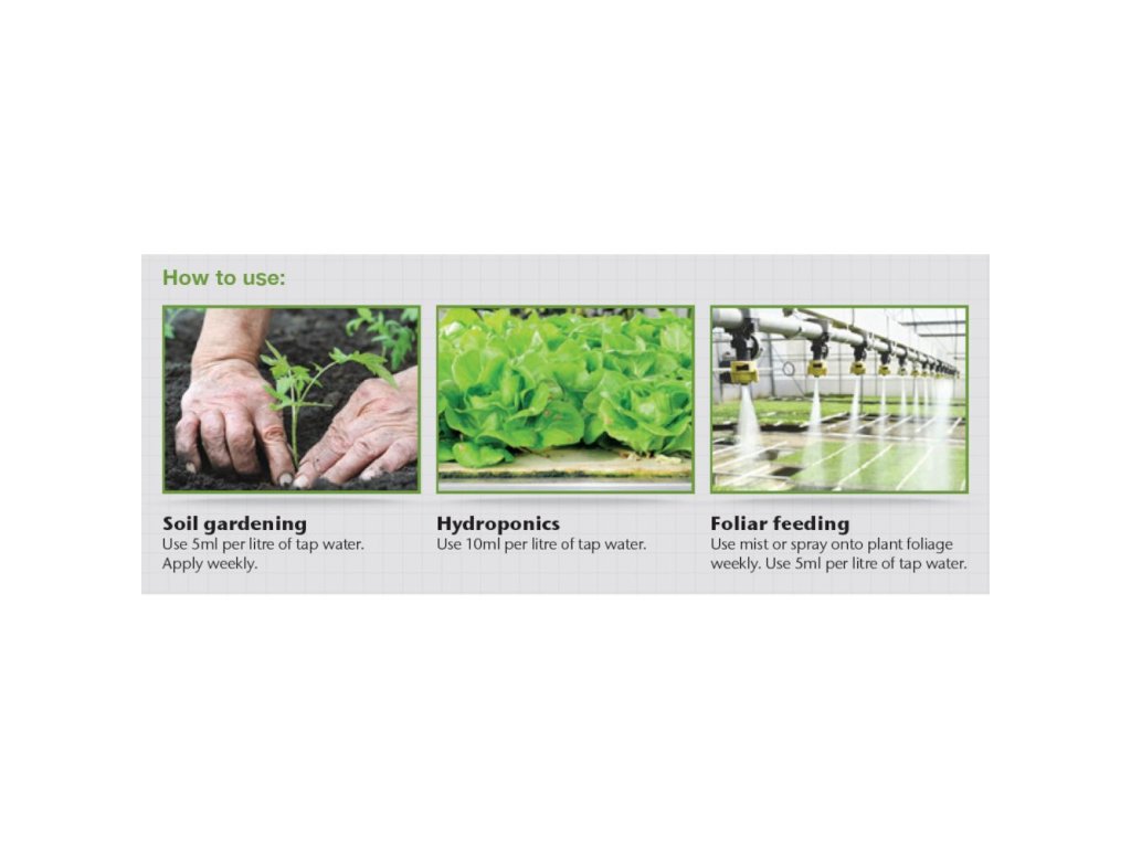 Je vhodný pro hydroponické nebo půdní pěstování a doporučuje se zejména pro listovou výživu.