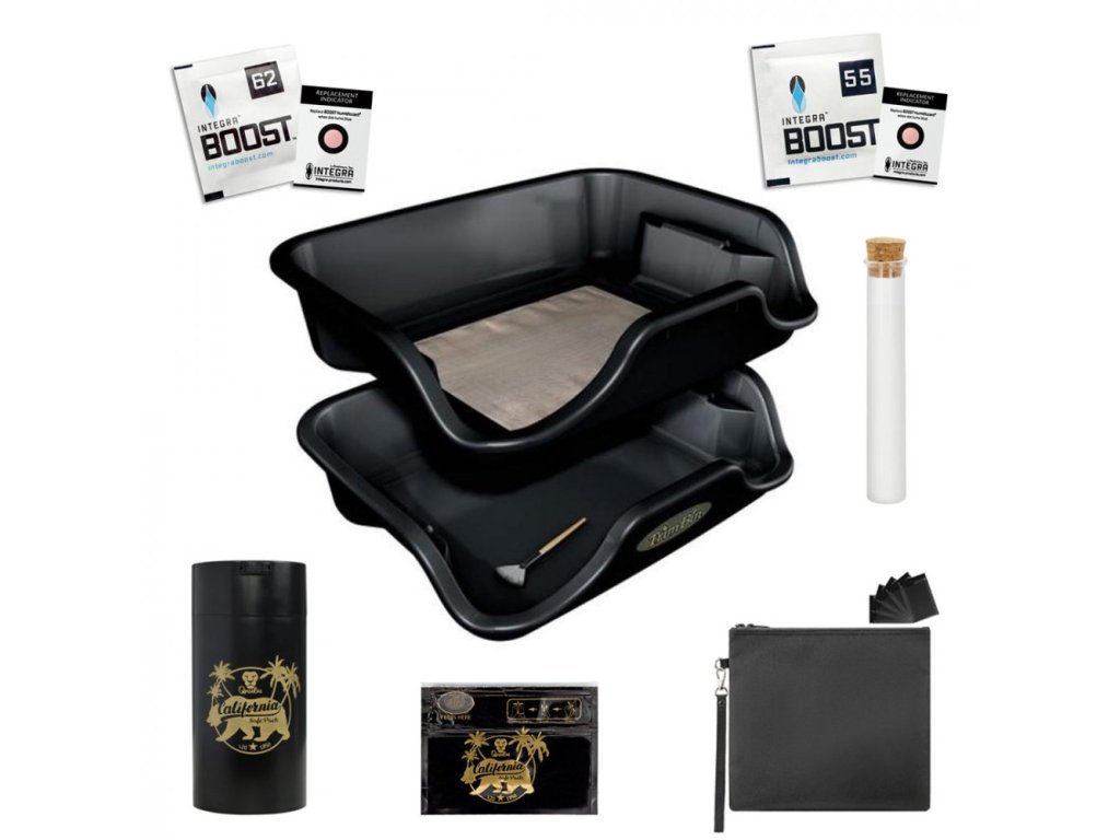 Velka sada na skladování bylinek, Herbal Set Expert, obsahuje ruční střihač Bowl Trimmer, 2x velkou podtlakovou dózu Qnubu California, 2x sáček Qnubu Press To Open 7 g a 3.5 g, 12cm skleněnou zkumavku a sáčky Integra Boost.