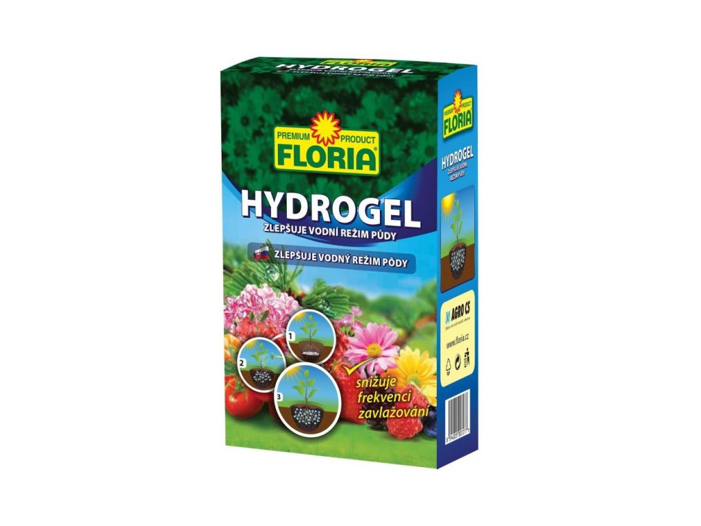 Hydrogel Floria je práškový koncentrát, který po přidání vody silně nabobtná a vytváří stabilní gel zlepšuje kontakt kořenů se zeminou. Tím zlepšuje příjem živin a snižuje úmrtnost rostlin při přesazování.