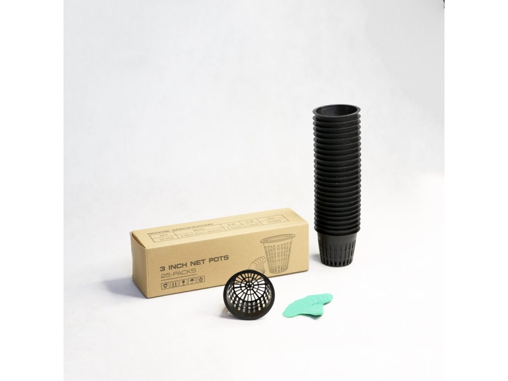 Hydrokošíčky z tvrdého plastu o průměru 8 cm jsou vhodné pro hydroponii i aeroponii. Box obsahuje 25 květináčů a 12 plastových štítků pro označení bylinek. K prodeji pouze v boxu.