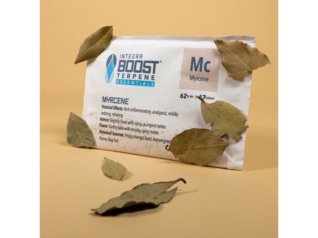 Voňavé terpeny Integra Boost® Terpene Essentials Myrcene. Chuťový profil je definován lehce květinovou a kořeněnou vůní s ostrým nádechem a zemitým profilem. Hmotnost 67 g, vlhkost 62 %, balení 1 ks.