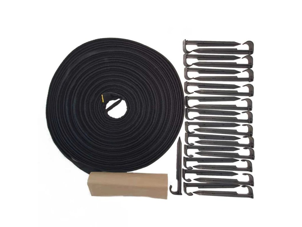 Obsahuje 25 m ploché zavlažovací hadice a dostatek kolíků a spojovacích prvků pro rozdělení na 10 délek.