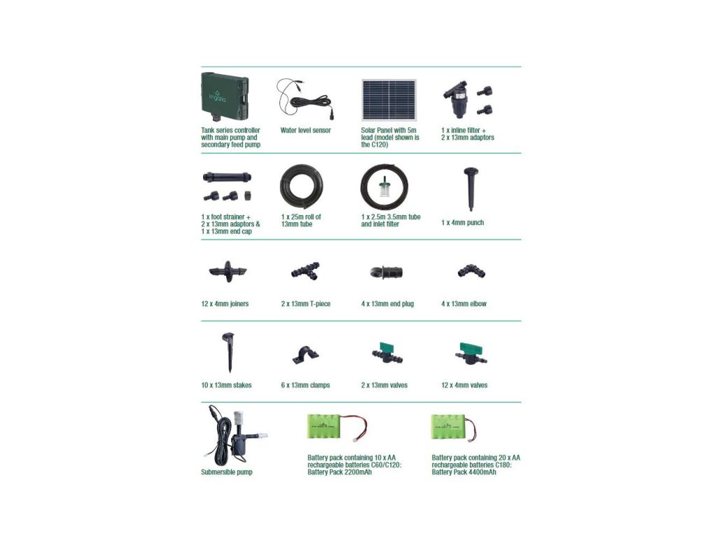 Model C180 se dodává s 25 m dlouhým páteřním potrubím o průměru 13 mm, ke kterému lze připojit prodlužovací sady Irrigatia pomocí přiloženého 4mm děrovače a spojovacích prvků. Zařízení C180 vyžaduje 20 x dobíjecí baterie AA, které jsou součástí dodávky.