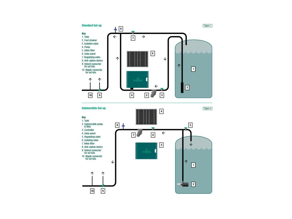 SOL-C180 je největší model řady Irrigatia, který zavlažuje až 180 zavlažovacích jednotek (IU). Sada obsahuje řídicí jednotku Tank Range SMART s integrovaným zavlažovacím čerpadlem a také sekundární čerpadlo pro míchání živin pro rostliny v průběhu zavlažování. Samostatný solární panel je dodáván s 5m kabelem a montážními držáky, které umožňují jeho instalaci na slunečném místě. Pokud je třeba solární panel umístit dále, lze zakoupit volitelný 5m prodlužovací kabel.