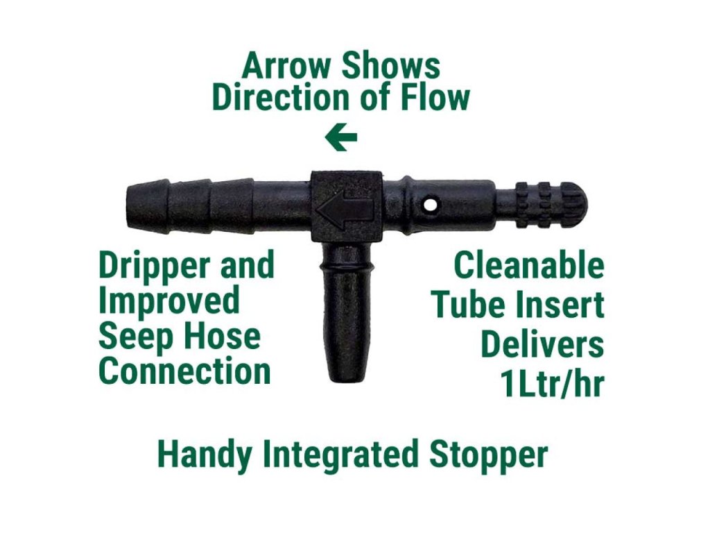 Aktualizovaný čistitelný odkapávač, nyní včetně zátky a vylepšeného připojení pro prosakovací hadici. Dripper je vhodný pro všechny výrobky Irrigatia.