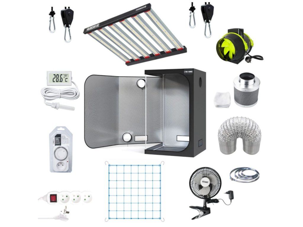 Stan 100x100x200 cm se stříbrnou fólií, LED osvětlení 360W, ventilace s odtahovým i cirkulačním ventilátorem a pachovým filtrem. a další příslušenství (měřič teploty a vlhkosti, prodlužovací kabel, rope ratchet závěsy). Včetně elastické opěrné sítě pro rovný růst rostlin.