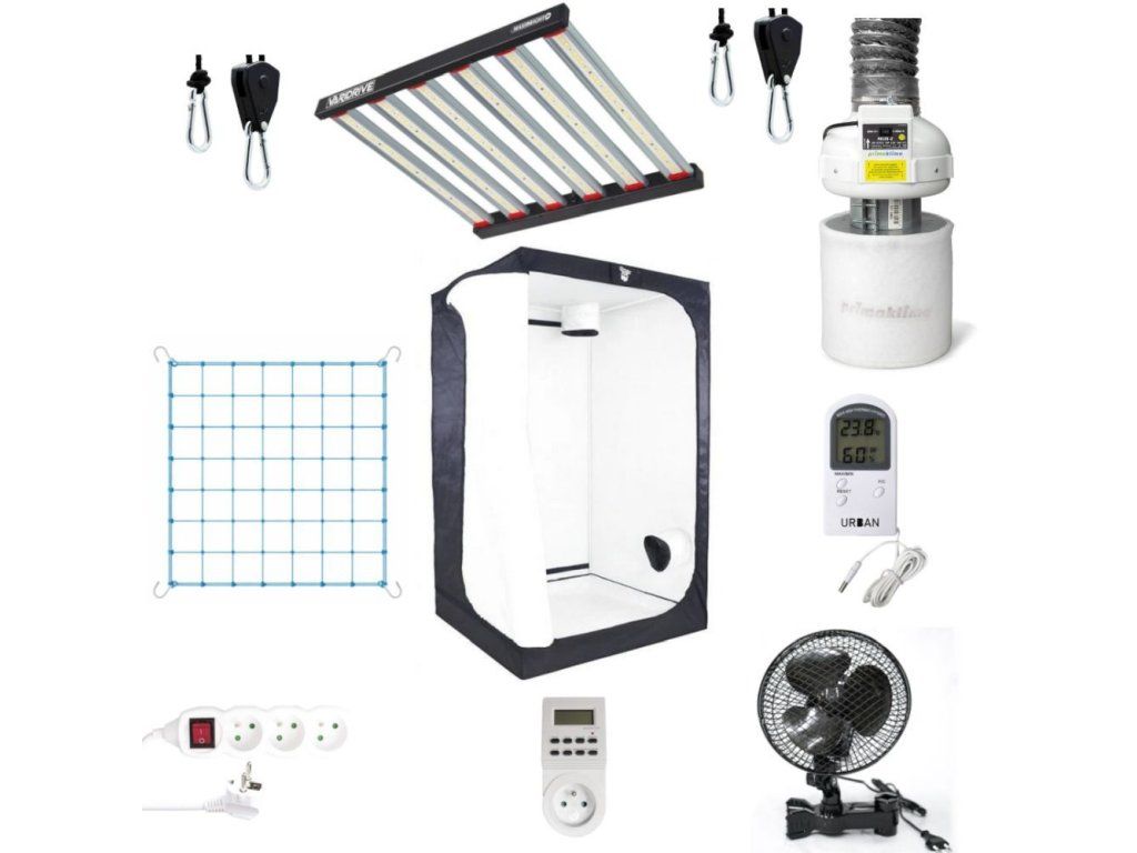 Stan 100x100x200 cm s bílou fólií, LED osvětlení 360W, ventilace s odtahovým i cirkulačním ventilátorem a pachovým filtrem. a další příslušenství (měřič teploty a vlhkosti, prodlužovací kabel, rope ratchet závěsy). Včetně elastické opěrné sítě pro rovný růst rostlin.
