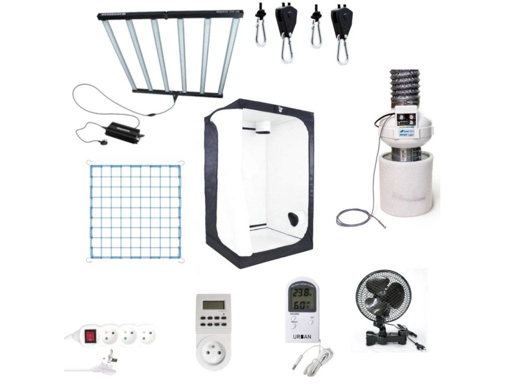 Stan 120x120x200 cm s bílou fólií, LED osvětlení 720W, ventilace s odtahovým i cirkulačním ventilátorem a pachovým filtrem a další příslušenství (měřič teploty a vlhkosti, prodlužovací kabel, rope ratchet závěsy). Včetně elastické opěrné sítě pro rovný růst rostlin.