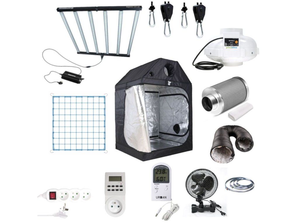 Speciálně tvarovaný stan 120x120x200 cm se stříbrnou fólií, LED osvětlení 720W, ventilace s odtahovým i cirkulačním ventilátorem a pachovým filtrem a další příslušenství (měřič teploty a vlhkosti, prodlužovací kabel, rope ratchet závěsy). Včetně elastické opěrné sítě pro rovný růst rostlin.