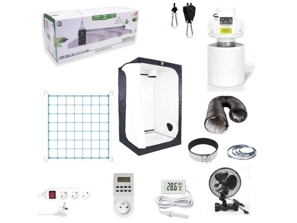 Stan 100x100x200 cm s bílou fólií, Sanlight LED osvětlení 400W, ventilace s odtahovým i cirkulačním ventilátorem a pachovým filtrem. a další příslušenství (měřič teploty a vlhkosti, prodlužovací kabel, rope ratchet závěsy). Včetně elastické opěrné sítě pro rovný růst rostlin.