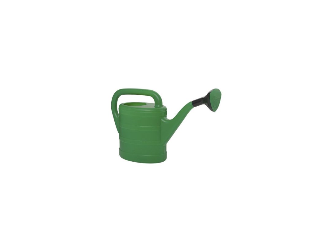 Zelená konev na zalévání rostlin a zahrady s objemem cca 5 litrů.