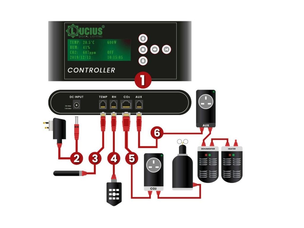 Lucius CO2 sonda, switch box a 2 kabely jsou kompatibilní s Lucius Digital Controller a svítidly stejné značky. Zařízení umožňuje přesné dávkování CO2 v pěstebním prostoru.