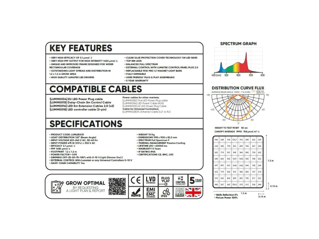 Vyšší specifikace LUMATEK ZEUS 465W PRO 3.1 LED je lineární vícesvětelné barové svítidlo, které produkuje velmi vysokou úroveň PPF 1450 mol/s a fotonovou účinnost až 3,1 mol/J.