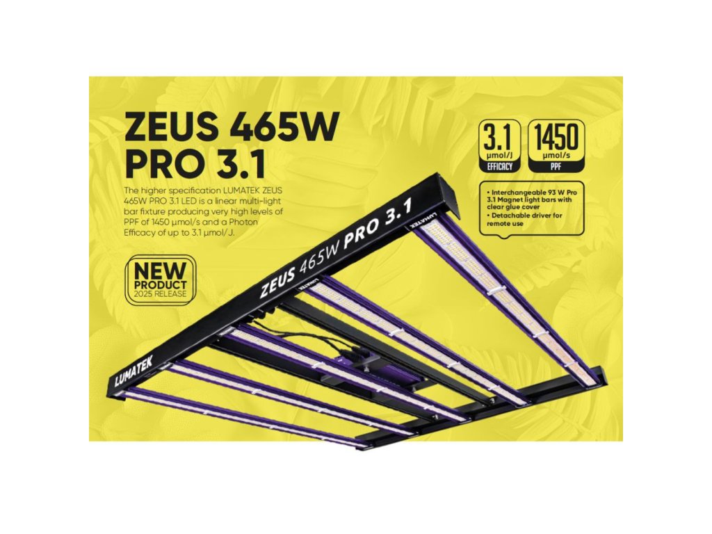 Nová verze Zeus 465W PRO 3.1, navržená pro optimální výkon s vylepšenou účinností 3.1, je ideální pro pěstební prostory o rozměrech 1,2 × 1,2 m a poskytuje vysokou intenzitu světla s nízkou spotřebou energie pro maximální produktivitu.