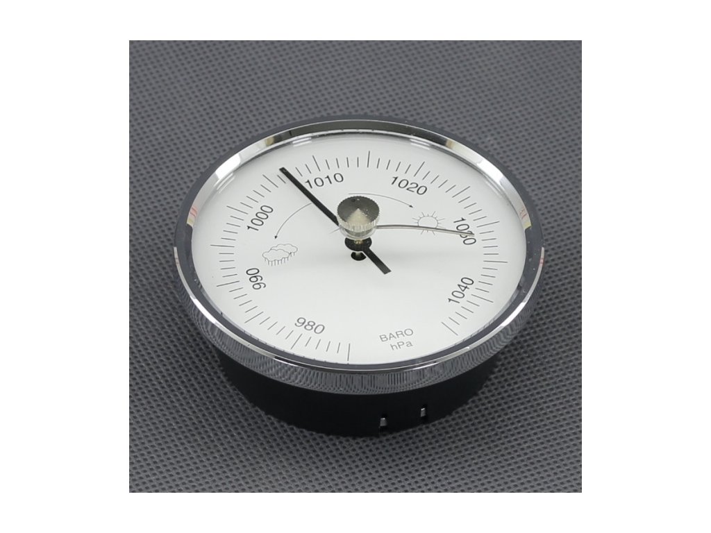 Klasický kulatý analogový barometr nebo také tlakoměr, měří a zobrazuje atmosférický tlak. Rozsah měření tlaku 980hPa až 1040hPa. Zobrazení tlaku v hPa s ikonkami počasí. Jedna ručička pro vlastní posun na stupnici. Stříbrná obruba a bílé pozadí, černá stupnice. Nepotřebuje žádné baterie. Umístění na plochu, nebo na stěnu, nebo do otvoru. Pro vestavbu je třeba otvor o průměru 56mm. Interiérový/ exteriérový barometr vhodný pro pohodlné měření atmosférického tlaku a předpovědi počasí.
