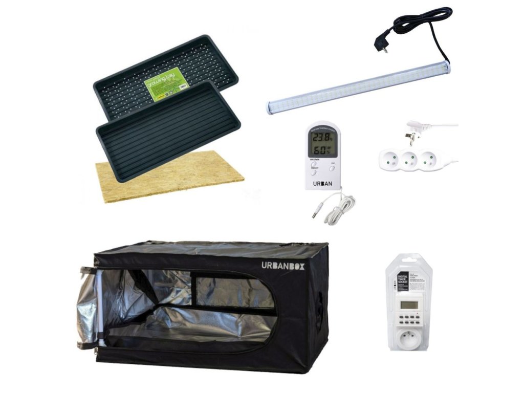 Komplet pro domácí pěstování microgreens obsahuje propagátor Urban o rozměrech 80x60x40 cm, 2x LED osvětlení na růst, 1x mechanické spínací hodiny, 3x Microgreens Tray bez drenáže, 2x Microgreens Tray s drenáží, 2x Grodan Cress Plate a 2x konopnou rohož Hempflax.