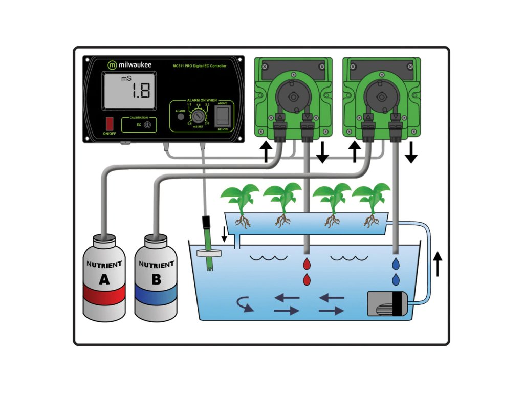 EC controller Milwaukee MC745 umožňuje automatickou úpravu EC a dávkování hnojiv pomocí dvou čerpadel MP810. Vhodné pro dvousložkové výživy A+B.